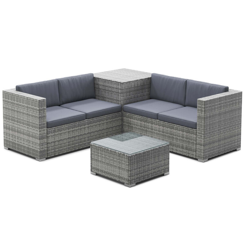 Diese Lounge besticht nicht nur durch ihren besonderen Komfort, sondern auch durch die dazugehörende Gartenbox. Die bequemen Polsterkissen können über Nacht einfach in der Kiste verstaut werden. Der ästhetische Gartentisch mit Glasplatte bietet eine grosszügige Ablagefläche für Kaffee, Bücher, Sonnenbrillen. Schaffen Sie sich eine gemütliche Ecke auf Ihrem Balkon oder Ihrer Terrasse mit dieser Rattanlounge SAN MARINO!