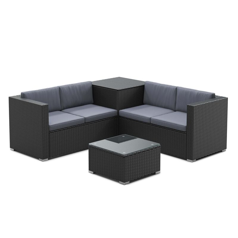 Diese stilvollen und hochwertigen Gartenmöbel passen auf jede Terrasse und in jeden Garten. Das klassische Schwarz harmoniert bestens mit den anthrazitfarbenen Kissen. Die Polsterkissen sind ausserordentlich pflegeleicht. Ergänzt wird die Lounge durch einen rechteckigen Beistelltisch mit Glasplatte und einer praktischen Kissenbox mit Deckel. Lassen Sie gemütlich den Sommerabend ausklingen mit der Rattanlounge SAN MARINO!
