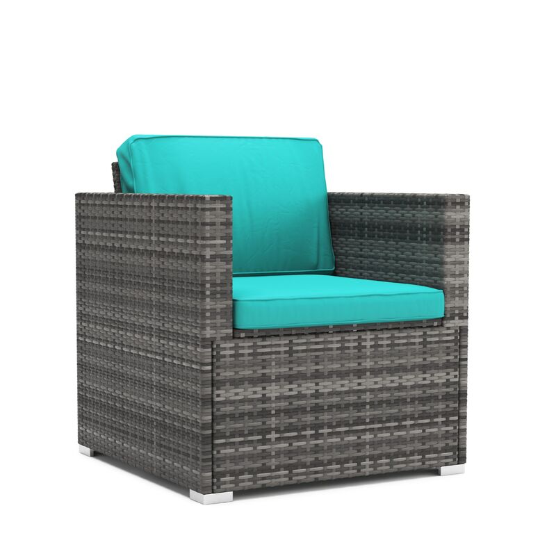 Der Rattansessel KOS mit Polsterkissen in kräftigem Türkis setzt einen sommerlichen Farbakzent. Er ist als Einzelsessel genauso ideal wie als Ergänzung zu einer Lounge. Die bequem gepolsterte Sitzfläche und die komfortable Rückenlehne laden zum gemütlichen Verweilen ein. Auf den breiten Armlehnen können Sie auch mal ein Buch ablegen oder ein Glas hinstellen. Der robuste Metallrahmen mit Polyrattangeflecht und die wasserabweisenden Kissenbezüge sorgen für Witterungsbeständigkeit. Lehnen Sie sich entspannt im Sessel zurück und geniessen Sie den Sommer auf der Terrasse oder im Garten!