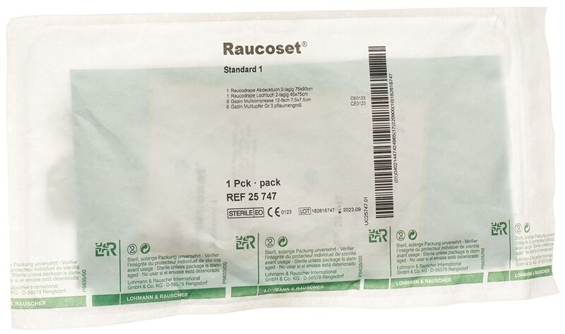 Das Raucoset Standard I ist ein mehrteiliges steriles Set bestehend aus einem Raucodrape Abdecktuch, einem Raucodrape Lochtuch, 8 Gazin Mullkompressen sowie 6 Gazin Tupfern aus Verbandmull.