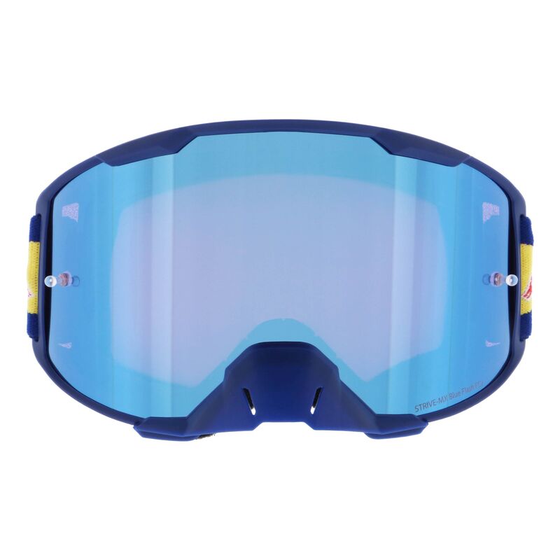 RedBull Strive ist die neuste Motocross Brille von Red Bull SPECT Eyewear. Getestet und immer im Einsatz ist diese Brille bei Luc Ackermann dem jüngsten Freestyle Motocross Weltmeister der Geschichte. Im Lieferumfang zusätzlich enthalten sind 1 Gesichtsschaum zum wechseln und 1 klare Ersatz-Scheibe. * Die STRIVE-Linse ist aus schlagfestem Polycarbonat gefertigt und übertrifft die Qualität optischer Gläser durch den Einsatz unserer iBoost Technologie für verbesserte Kontraste und Blendreduzierung. * Der STRIVE-Rahmen ist aus TPU-Material geformt. Dieser Kunststoff behält seine Weichheit bei allen Umgebungstemperaturen. Er passt sich Ihrem Gesicht an, ohne Luftspalten zu hinterlassen, unter allen Umständen. * Die Schaumstoffschicht, die normalerweise den Luftraum zwischen den beiden Gläsern bildet, wurde wurde übersprungen. Für eine Sicht, die frei von Brechungen und Verzerrungen ist, wurde die Doppelscheibe von uns zusammenlaminiert. * In Kombination mit einem dünnen Rahmendesign bietet die Linse ein bis zu 15% ein um bis zu 15% vergrössertes Sichtfeld, so wird der Tunnelblick vermieden. * Die Belüftungsöffnungen sind mit einem dünnen PU-Schaumstoff überzogen, der eine ausreichende Belüftung der Brille gewährleistet und das Eindringen von Wasser oder Schlamm in das Sichtfeld verhindert. * Inklusive Nasenschutz – einfaches Click-On/Off-System. * Die Ultra-Anti-Fog-Innenscheibe widersteht dem Beschlagen über 180 Sekunden und übertrifft die geforderte Norm von 30 Sekunden um den Faktor 6. * Der Gesichtsschaum der STRIVE Goggle besteht aus vier Schichten. Schicht eins besteht aus Klettmaterial. Sie sorgt dafür, dass verschmutzte oder beschädigte Gesichtsschäume leicht ausgetauscht werden können. Schicht zwei bietet Stabilität für die Verbindung Gesicht/Brille indem sie etwas Steifigkeit hinzufügt. Eine weichere Schaumstoffschicht schliesst dann alle Luftspalten und sorgt für einen komfortablen Sitz. Die oberste Schaumstoffschicht ist sehr dünn und weich, verhindert Scheuern, Hautirritationen und reduziert das Schwitzen.