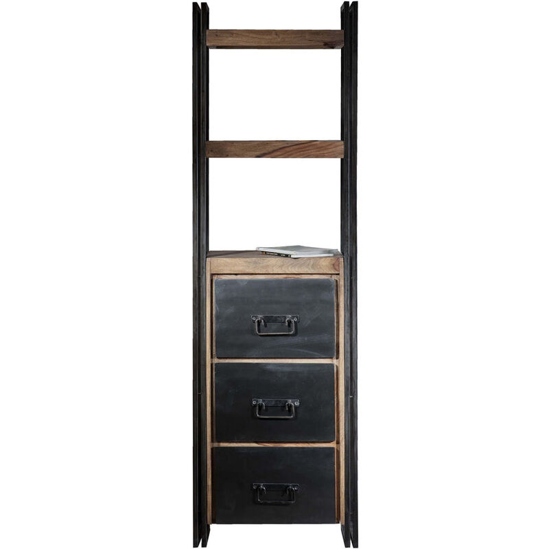 Regal – Regal Ecuador – Holz – B 60 T 40 H 200 cm – Regal aus gebeiztem Sheesham. Geölt mit Altmetall und Gebrauchsspuren. Das Regal besitzt drei Schubladen und zwei feste Böden. Belastbarkeit: 70 kg.