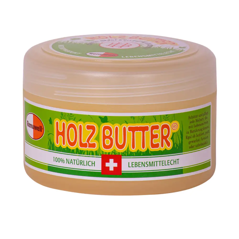 Renuwell Holz-Butter ist der neue Allrounder unter den Produkten zur Oberflächenbehandlung. Einfach anzuwenden, vielfältig einsetzbar und natürlich noch dazu!Die Holz-Butter kann sowohl für Erstbehandlungen als auch zur Nachbehandlung verwendet werden. Ausserdem kann sie für die Auffrischung und Pflege eingesetzt werden. Renuwell Holz-Butter verträgt sich mit geölten oder gewachsten Oberflächen ebenso, wie mit lackierten. Auch rohe und furnierte Holzwerkstücke nehmen die Holz-Butter sehr gut an.Die einzigartige, markenrechtlich geschützte Produktrezeptur enthält nur natürliche Zutaten, die genau auf die Eigenschaften von Holz abgestimmt sind. Die Holzbutter zieht in das behandelte Holz ein und pflegt das verarbeitete Holz. Gleichzeitig bildet sie einen Schutzfilm auf der Holzoberfläche, die sich der Farbe des Holzes anpasst und einen seidenmatten Glanz entstehen lässt. Der Schutzfilm verhindert das Austrocknen des Holzes und lässt Flüssigkeiten abperlen. Auch nach der Anwendung bleibt das Holz offenporig und atmungsaktiv.Mit einem sauberen, fusselfreien Lappen wird die Holz-Butter auf dem Werkstück verteilt und gleichmässig eingerieben, anschliessend soll sie zwei bis drei Stunden einwirken. Nun kann die Oberfläche nachpoliert werden. Renuwell Holz-Butter eignet sich auch für Anfänger, da bei der Oberflächenbehandlung keine Flecken entstehen. Natürlicherweise wird unbehandeltes Holz nach der Anwendung ein wenig dunkler.