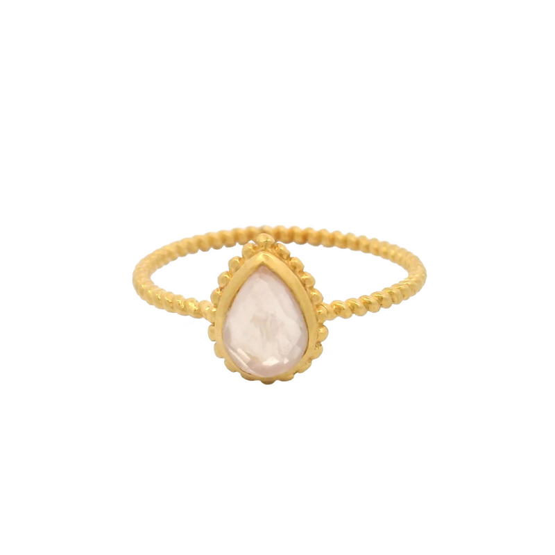 Der Ring Marie Rosenquarz setzt sich zusammen aus einem Rosenquarz, welcher facettiert und eingefasst ist in eine Tropfenform aus Silber 925.