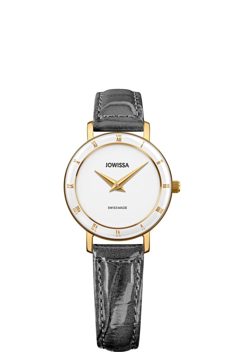 UhrwerkSchweizer Quarz-Uhrwerk der Marke Ronda mit Stunden- & Minutenanzeige und langer Batterielaufzeit ZifferblattEmaille Optik ZeigerDauphine-Stil, diamantiert GehäuseRostfreies Edelstahlgehäuse GehäuseoberflächeGlanzpoliert und ionenbeschichtet in gold GehäusebodenEdelstahl Pressboden ohne Schrauben für den einfachen Batteriewechsel Gehäusedurchmesser26 mm Gehäusehöhe6 mm Wasserdichtigkeit5 ATM (regenfest) UhrglasGehärtetes Mineralglas mit poliertem Kantenbruch IndexRömische Ziffern im Glas integriert LunetteIm Glas integriert als Metallisierung BandmaterialEchtes Leder-Uhrband mit glanzlackierter Alligatorprägung Bandanstossbreite12 mm SchliesseAus Edelstahl mit lasergraviertem Logo VerstellbereichHandgelenkumfang von 140-190 mm Auswechselbares BandJa, mit quick release GeschlechtWeiblich Swiss Madein der Schweiz von Hand assembliert ColorGold / Weiss / Grau ReferenceJ2.283.S