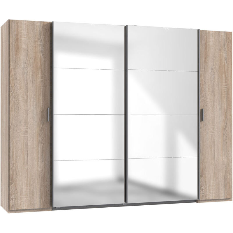 Dreh-/Schwebetürenschrank mit 2 Spiegeltüren – Schrank Filipo – Holzwerkstoff – B 227 T 65 H 210 cm – Tablarmasse von links nach rechts: 43cm/43cm/87cm/43cm