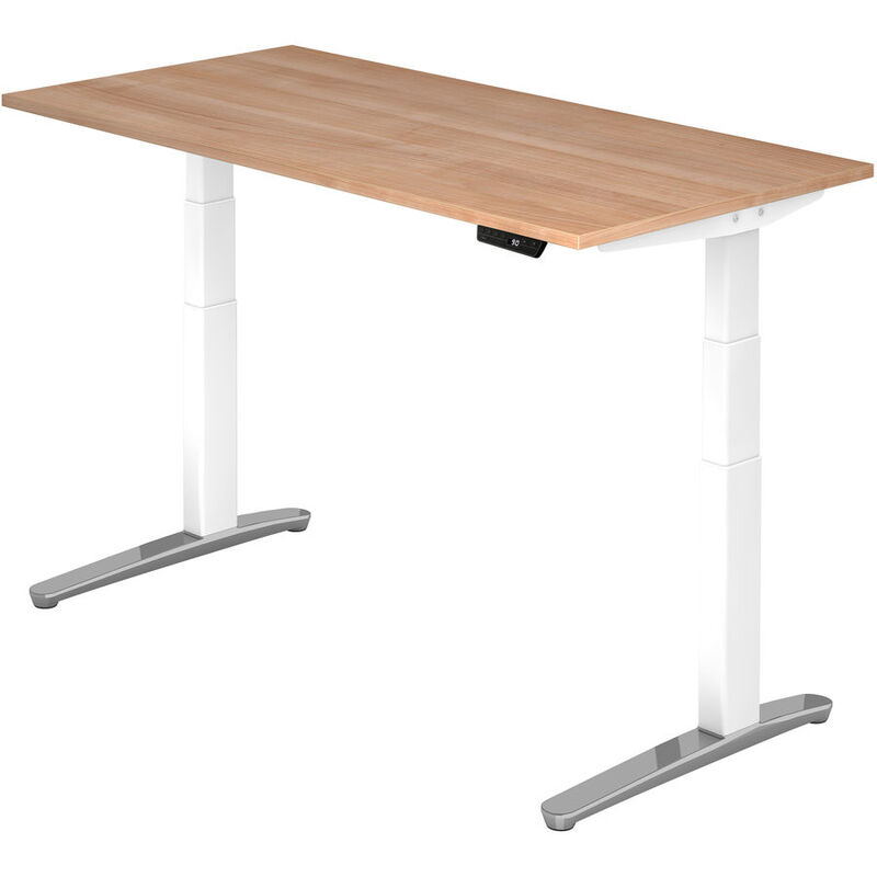 Schreibtisch – Schreibtisch Office – Holzwerkstoff – B 160 T 80 H 130 cm – Arbeitshöhe 65–130 cm; Höhenjustierung ± 5 mm; Plattendicke 2,5 cm; Reckteckrohr 10,7 x 6,7 cm, 2-stufig; Kabel 3 m lang – 2 Motoren in den Säulen integriert; abklappbarer Kabelwanne enthalten; Auffahrschutz; 4 Speicherplätze