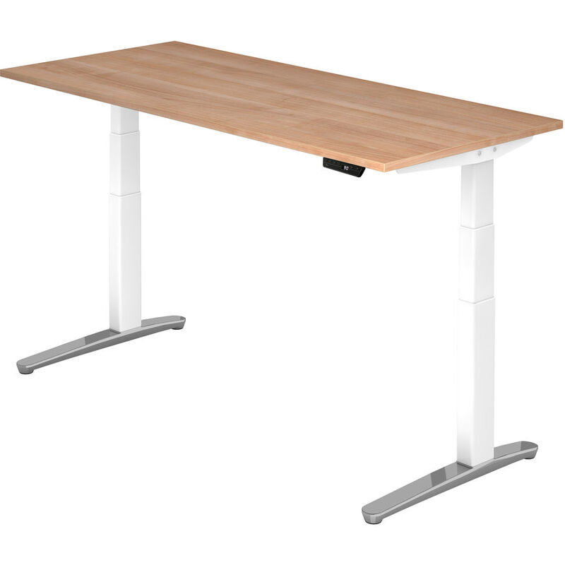 Schreibtisch – Schreibtisch Office – Holzwerkstoff – B 180 T 80 H 130 cm – Arbeitshöhe 65–130 cm; Höhenjustierung ± 5 mm; Plattendicke 2,5 cm; Reckteckrohr 10,7 x 6,7 cm, 2-stufig; Kabel 3 m lang – 2 Motoren in den Säulen integriert; abklappbarer Kabelwanne enthalten; Auffahrschutz; 4 Speicherplätze