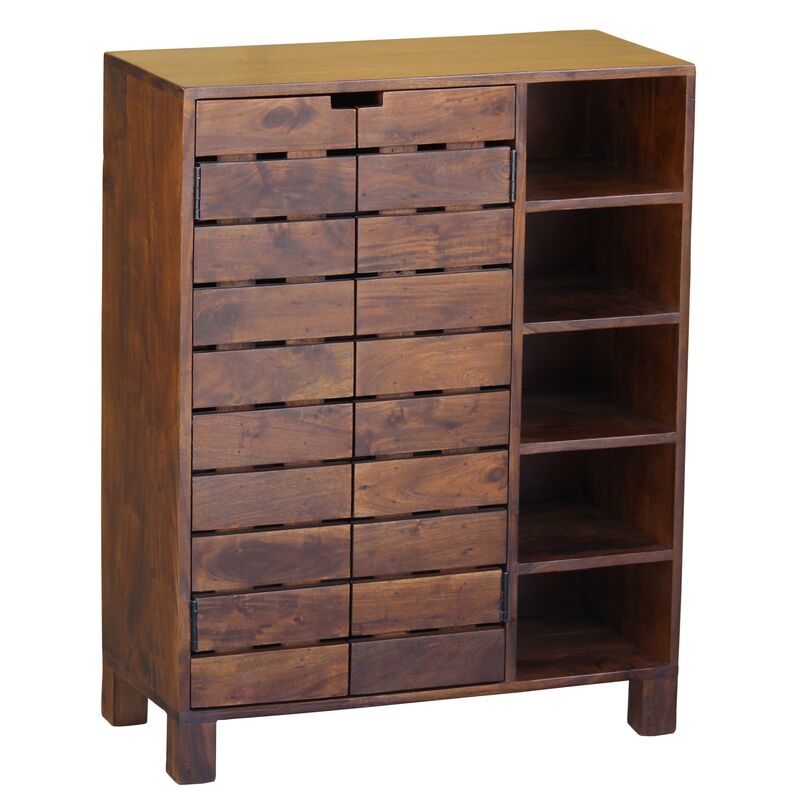Dieser Schrank für Schuhe aus Akazienholz besticht durch eine edle Optik und durch den grosszügigen Stauraum. Die beiden praktischen Flügeltüren mit ansprechender Lattenstruktur gewährleisten eine gute Durchlüftung der Fussbekleidung auf vier Tablaren. Die Schuhsammlung kann auch auf den fünf offenen Ablageflächen ausgestellt werden. Metallscharniere und ein praktischer Einrastmechanismus garantieren ein problemloses Öffnen und Schliessen der Schranktüren. Das Akazienholz ist robust, langlebig und verzieht sich deutlich weniger als andere Holzarten. Schaffe Ordnung in deinem Eingangsbereich mit diesem edlen Schuhschrank SYLVIE!