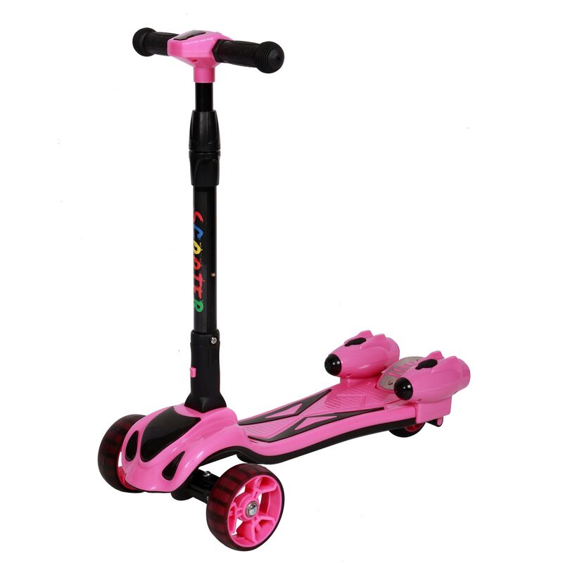 Mit diesem Scooter in knalligem Pink fällt Ihr Kind bestimmt auf! Die integrierten Gadgets wie farbige LEDs und Sound bringen Kinderaugen zum Leuchten. Doch damit nicht genug – mit diesem Scooter können Kids mit Volldampf herumkurven! Denn das Kickboard verfügt am Heck über Dampfdüsen, die für einen coolen Effekt sorgen! Über die Knöpfe am Lenker lassen sich die Funktionen ganz einfach steuern. Der Lenker ist ausserdem höhenverstellbar und die Hinterradbremse bringt das Trottinett zuverlässig zum Stehen. Worauf warten Sie? Auf die Plätze, fertig – und Volldampf!