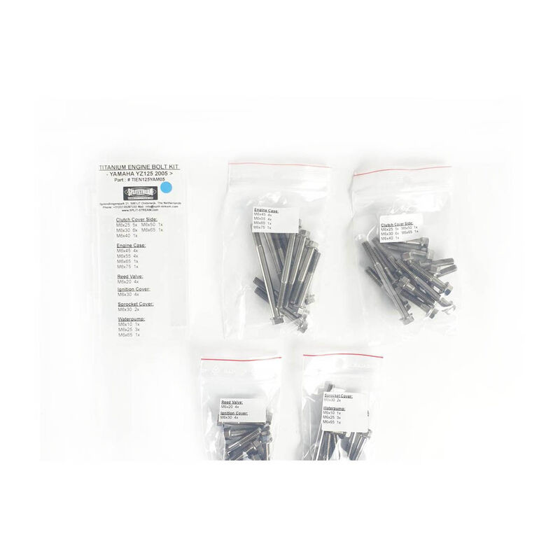 SPLITSTREAM TITAN MOTORSCHRAUBEN KIT Der Kit enthält M6 Titanschrauben Schrauben mit 8mm Flansch-Sechskantkopf für: * Kupplungsdeckel * Zündungsdeckel * Kurbelgehäuse * Wasserpumpenabdeckung * Membranblock (bei 2-Takt Modellen) * Kupplungszylinder (bei Modellen mit Hydraulikkupplung) * Ölfilterdeckel (bei 4-Takt Modellen) * E-Starter (bei Modellen mit E-Starter) Der genaue Lieferumfang mit Schraubenabmessungen ist auf den Produktbilder ersichtlich. Die Schrauben werden aus Titan Grade 5 (Ti 6Al-4V) hergestellt. Dies ist das Arbeitstier unter den Metallen und ist 2x stärker als normales Grade 2 Titan. Es bietet eine hohe Festigkeit und ein geringes Gewicht (das halbe Gewicht der serienmässigen Stahlschraube) und hohe Korrosionsbeständigkeit. TITANSCHRAUBEN IMMER MIT DEMSELBEN DREHMOMENT ANZIEHEN WIE VOM MOTORRADHERSTELLER FÜR DIE ORIGINALEN SCHRAUBEN VORGEGEBEN. Die Titanschrauben von Splitstream werden von vielen AMA und internationalen Motocross und Supercross Teams verwendet. titanium motor bolt,motorschrauben aus titan,bulloni motore in titanio,boulons de moteur en titane,factory motorschrauben,Titan Grade 5,titan schrauben,titan schruube,titanium bolt,titanium screw,vis titanium,flange hex bolt,vis en titane,vite in titanio,titanschraube mit schaft,titanschraube mit flansch Passend auf: YAMAHA YZ125