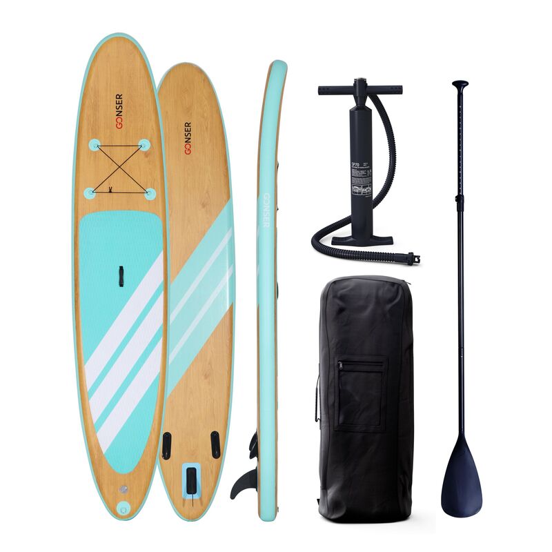 Mit der Natur verbunden – mit diesem aufblasbaren SUP paddelst du wie auf einem komfortablen Floss! Das Stand Up Paddle Board kommt in schöner Holzoptik daher und mixt Moderne mit Ursprünglichkeit. Die Anti-Rutsch-Oberfläche garantiert einen festen Stand und angenehmen Fusskomfort. Die Finnen auf der Unterseite des Bretts wirken unterstützend bei der Balance und ermöglichen ein sanftes Gleiten über den See. Eine Pumpe zum Aufblasen sowie ein stabiles Paddel aus Aluminium sind im Lieferumfang inbegriffen. Bei Nichtgebrauch kann das Board zusammengelegt und platzsparend in der Transporttasche verstaut werden. Das SUP ist sowohl für Anfänger als auch für geübte Sportler geeignet. Wir versprechen: Noch nie hat Sport so viel Spass gemacht!