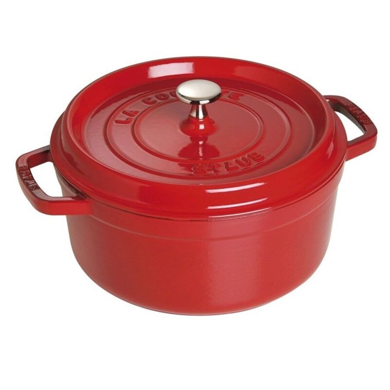 Cocotte 24cm, rund, Kirsch-Rot, Gusseisen 3.8l – Gusseisentopf STAUB – Gusseisen – B 30.3 T 24 H 15.3 cm – Topfhöhe (ohne Deckel): 10,50 cm, Oberer Durchmesser: 24,00 cm, Bodendurchmesser: 19,20 cm, Grifflänge: 2,00 cm – Dank der Tropfenstruktur unter dem flachen Deckel wird das Gargut kontinuierlich mit kondensierter Garflüssigkeit befeuchtet – Speisen werden saftig und zart.