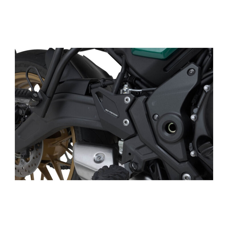 SW-MOTECH FERSENSCHUTZ, SCHWARZ Gut geschützt: Dieser Fersenschutz verhindert das Touchieren des heissen Auspuffs oder der Kette und schützt vor den Bewegungen der Schwinge. * Zur Montage an der linken und rechten Seite * Modellspezifische Entwicklung für optimale Form und Grösse * Formschön und hochwertig verarbeitet * Einfache Montage an bereits bestehenden Anbaupunkten * Schutz deines Stiefels vor Berührungen des heissen Auspuffs , der Kette oder Bewegungen der Schwinge LIEFERUMFANG: * 2x Fersenschutz * Montagematerial * Anbauanleitung BACKYARD RACING DETAILS: * Material: Aluminium * Oberfläche: Eloxiert * Farbe: Schwarz fersenschutz,fersenschoner,protezione per il tallone,protection du talon,talonnette,heel guard,heel protector Passend auf: KAWASAKI Z 650 RS Z 650 RS / 50 YEARS