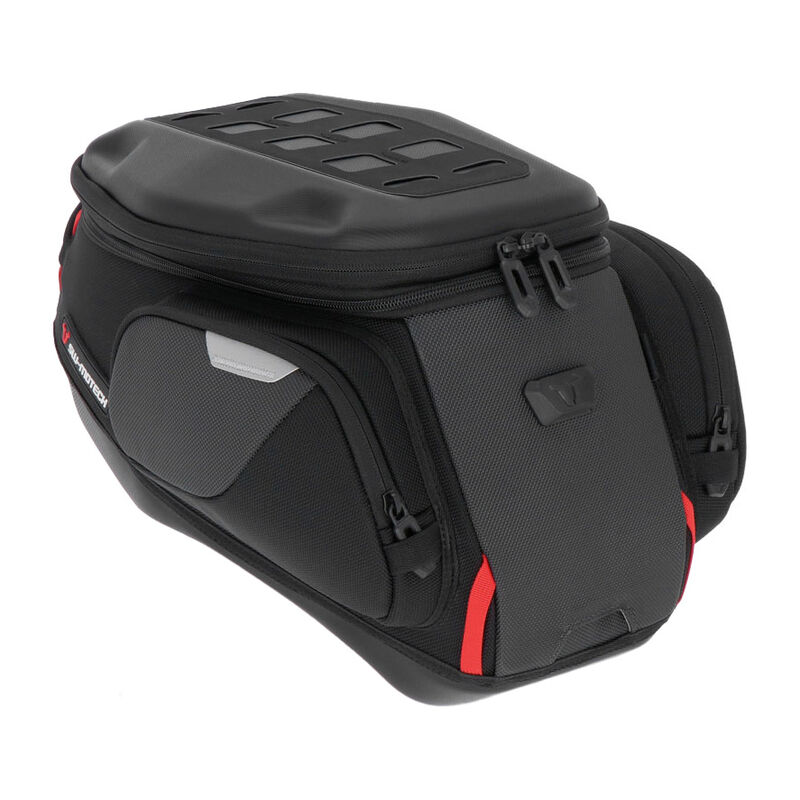 SW-MOTECH TANKRUCKSACK PRO CITY Der PRO City wurde für Adventure-Bikes und andere Motorräder mit steil verlaufender Tankform entwickelt. Obwohl der Tankrucksack bis zu 14 Liter Stauraum bietet, ermöglicht die schlanke Form auch im voll bepackten Zustand einen optimalen Lenkeinschlag. Zwei Aussentaschen geben zusätzlichen Stauraum. Die PRO Tankrucksäcke bieten elegantes und zeitloses Design in Verbindung mit langlebigen Materialien und durchdachten Produkteigenschaften: Ballistic Nylon schützt das Gepäck vor Stössen, Wind und Wetter. Die Oberseite aus laminiertem EVA-Material gibt den Taschen eine markante Form und gewährleistet in Verbindung mit einem MOLLE-Aufsatz sicheren Halt für Smartphone- und Tablethalter. Die bereits ab Werk befestigte Führungsschiene des Oberrings erlaubt eine deutlich vereinfachte Anpassung des Tankrucksacks an die Form des Tanks und die ergonomischen Bedürfnisse des Fahrers. Diese Flexibilität bieten nur die PRO Tankrucksäcke. Passend dazu bietet SW-Motech die patentierten PRO Tankringe aus glasfaserverstärktem Kunststoff. Sie werden abgestimmt auf das Motorradmodell gefertigt. Der robuste PRO Tankring mit magnetischer Führungshilfe sichert die PRO Tankrucksäcke durch einen mechanischen QUICK-LOCK Rastverschluss. So lassen sich die Tankrucksäcke mit nur einem Handgriff befestigen oder abnehmen. * Volumenerweiterung per Reissverschluss von 11 auf 14 Liter * 2 Aussentaschen * Für die Befestigung des PRO Tankrucksacks benötigst du den passenden PRO Tankring für dein Motorradmodell. * Magnetische Führungshilfe im PRO Tankring für einfache Befestigung * Vormontierte Führungsschiene des Oberrings für ergonomische Anpassung des Tankrucksacks * Oberseite und Boden des Tankrucksacks aus laminiertem und formstabilem EVA-Material * Aus robustem und besonders UV-beständigem 1680D Ballistic Nylon mit wasserabweisender Innenbeschichtung * MOLLE-Aufsatz aus stabilem Hypalon-Material auf der Oberseite für Smartphone- und Tablethalter * Reflektierende Details für bessere SichtbarkeitNetzfächer im Inneren * Witterungsschutz durch mitgelieferte Regenhaube * Robuster Tragegriff * Kabeldurchlass an der Vorder- und Rückseite * Mit Kabelschloss oder Diebstahlsicherung verwendbar LIEFERUMFANG: * 1x PRO City Tankrucksack * 1x PRO Oberring * 1x Regenhaube PRO City * Montagematerial * Anbauanleitung HINWEIS: Für die Montage am Tank wird der passende PRO Tankring benötigt. Die Tankrucksäcke der PRO Serie sind nicht mit den EVO Tankringen kombinierbar. Achten Sie darauf, dass zwischen Tankrucksack und Tankoberfläche genügend Abstand ist (auch im beladenen Zustand), um Lackschäden zu vermeiden. Bei geringem Abstand kann die Tankoberfläche zusätzlich durch Lackschutzfolie oder ein Tankpad geschützt werden.