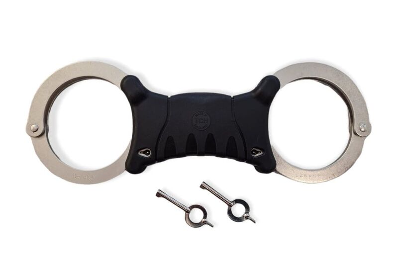 Die Handschellen 840 Rigid von TCH sind starre Handschellen gefertigt aus hochwertigem Stahl. Für eine angenehmere Anwendung ist die Verbindung mit robustem Kunstsoff überzogen, der durch seine ergonomische Form optimale Kontrolle über die geschlossene Person garantiert. Die präzise Fertigung gewährleistet, dass der Bügel zuverlässig durch die Schlossfalle fährt. Dank den rotierenden Bügeln können die Handschellen vorbereitet werden, damit sie im Einsatz rasch eingesetzt werden können (Speed Cuffing). Die 840 Rigid verfügen ausserdem über eine Schliesssperrvorrichtung, die bei angezogenen Handschellen ein weiteres Zuziehen der Bügel verhindert. Eigenschaften – Oberfläche: vernickelt – Material: Stahl / Kunststoff (Griff) – Umfang max: ca. 232 mm – Umfang min: ca. 158 mm – 25 Schliesspositionen – Sperrklinke: 6 Zähne – mit Schliesssperrvorrichtung Lieferumfang – TCH – Handschellen 840…