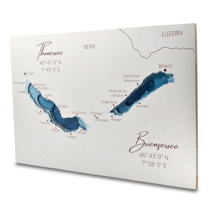 Die Seen sind dabei lasergeschnitten im 3D-Effekt auf hochwertigen Birkenholzplatten ausgeschnitten. Die Tiefe und die verschiedenen Blautöne erzeugen dabei eine einzigartige Wirkung. Auf der Seekarte sind zusätzlich die wichtigsten Orte, Koordinaten und auch Informationen zur Seetiefe abgebildet.