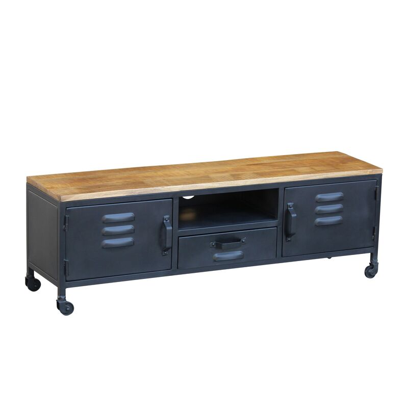 Mit diesem schicken Möbel holst du dir ein Unikat ins Wohnzimmer. Das einzigartige Aussehen entsteht aus dem Zusammenspiel von Metall und Holz. Dank der metallenen Konstruktion ist das Lowboard robust und kann mit den Rollen leicht verschoben werden. Die Platte aus Mangoholz hat eine individuelle Maserung und sorgt für eine wohnliche Atmosphäre. Zwei grosse Fächer und eine Schublade bieten viel Stauraum für DVDs, Ladekabel, Kuscheldecken etc. Durch die Öffnung im mittleren Fach können die Kabel von Fernseher und TV-Box unsichtbar angeschlossen werden. Freue dich auf ein praktisches TV Möbel im modernen Industrial Look!