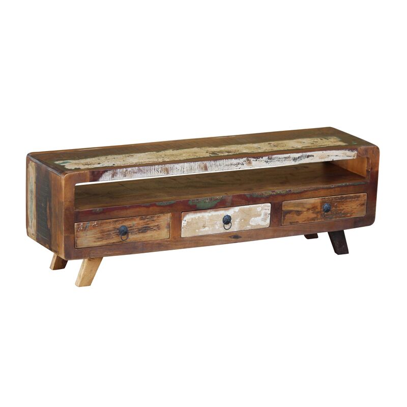 Dieses aussergewöhnliche TV-Möbel sorgt für eine gemütliche, rustikale Stimmung im Wohnzimmer. Das offene Ablagefach sowie die drei Schubladen bieten Stauraum für Elektronik und Kleinkram. Durch die Verarbeitung von wiederverwertetem Holz ist jedes Möbelstück ein Unikat mit eigenem Charakter. Nutze dieses effektvolle Lowboard für dein Fernsehgerät und freue dich auf unterhaltsame Filmabende!