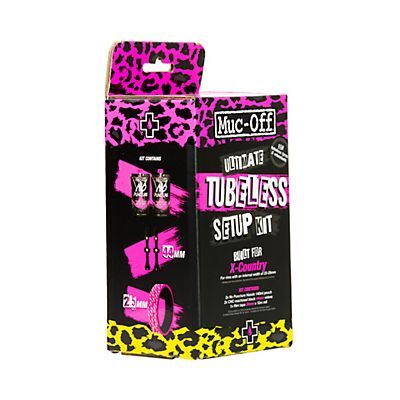 Das Muc-Off Ultimate Tubeless Kit beinhaltet sämtliches Zubehör, um einen tubeless-ready Laufradsatz zu montieren und zu fahren. Das Set besteht aus einem Muc-Off Tubeless Felgenband, Dichtungsflicken, 2 CNC-gefrästen schwarzen tubeless Ventilen und 2 Beuteln mit No Puncture Hassle Schlauchlos-Dichtungsmittel.