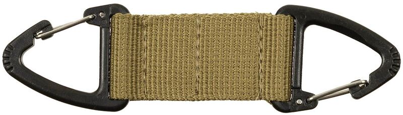 2 Karabinerhaken aus Kunststoff 3-lagiges Mittelteil Gesamtlänge: ca. 12 cm Masse Karabiner: ca. 3 x 3 cm Material: Mittelteil: 100 % Polyester Karabiner: 100 % Plastik