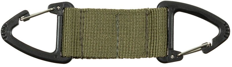 2 Karabinerhaken aus Kunststoff 3-lagiges Mittelteil Gesamtlänge: ca. 12 cm Masse Karabiner: ca. 3 x 3 cm Material: Mittelteil: 100 % Polyester Karabiner: 100 % Plastik