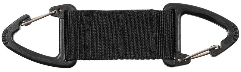 2 Karabinerhaken aus Kunststoff 3-lagiges Mittelteil Gesamtlänge: ca. 12 cm Masse Karabiner: ca. 3 x 3 cm Material: Mittelteil: 100 % Polyester Karabiner: 100 % Plastik