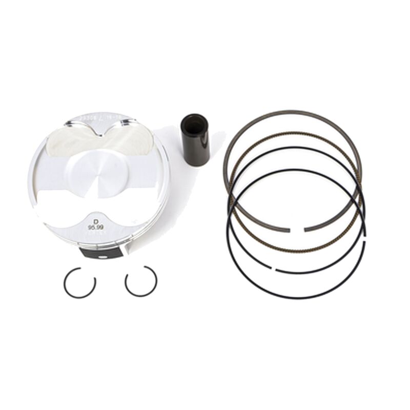 VERTEX KOLBEN KIT, TYPB HC Der italienische Hersteller VERTEX fertigt Kolben für gängige 2T und 4T Motoren, diese werden nach europäischen Qualitätsstandards gefertigt. Die Kolben werden bei einigen Marken auch als Erstausrüster Kolben verwendet. MIT DEM HC HIGH COMPRESSION KIT LIEFERT VERTEX EINEN SEHR HOCHWERTIGEN SCHMIEDEKOLBEN ENTWICKELT MIT VERTEX KNOW-HOW, RACE FORM UND MIT HÖHEREN VERDICHTUNGSVERHÄLTNIS. Für hohe Verschleissfestigkeit und Fresssicherheit sorgt die hochwertige Kolbenlegierung. Die Kolben werden alle mit einem speziellem Härte- und Anlasszyklus T-5/T-6 wärmebehandelt. Das Kolbenhemd ist mit einer leicht laufenden High-Tech-Molybdändisulfit-Beschichtung versehen, welche die Reibung zwischen Kolben und Lauffläche besonders während der Einfahrphase vermindert und die Kolbenlebensdauer zu erhöhen. Bei allen HC High Compression Kits sind Kolben, Kolbenringe, Kolbenbolzen und Sicherungsringe im Lieferumfang enthalten. Ersatz Kolbenringe können auch einzeln bestellt werden.Kompression 13.5:1 Kolben: TypB Kolbendurchmesser: Ø 95.97 mm Weitere Infos zum richtigen Kolbenmass finden Sie in unserem Kolben FAQ [1] Links: —— [1] https://www.backyard-racing.ch/kolben-das-richtige-mass-die-verschiedenen-kolben/kbi-32.html?language=de