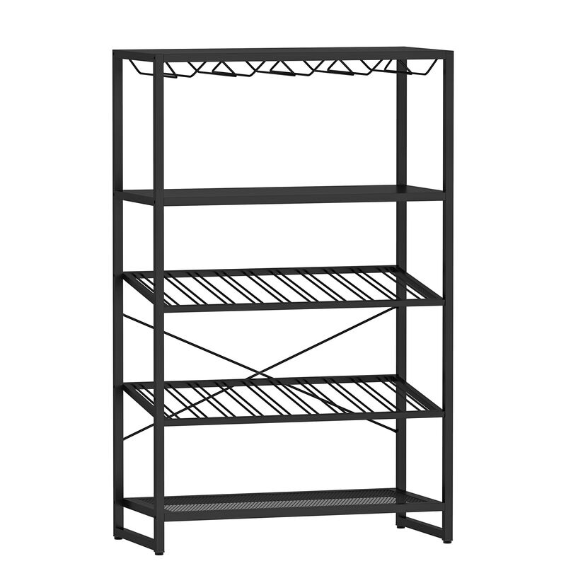 Geniesst du gerne zusammen mit deinen Gästen eine gute Flasche Wein? Dann ist dieses Weinregal ein Must-have für dein Wohnzimmer. Auf zwei schrägen Ablagen lassen sich 16 Weinflaschen perfekt in Szene setzen. Für die Gläser hat es zuoberst eine Aufhängevorrichtung, in welcher diese kopfüber ordentlich verstaut werden können. Hole dir dieses schlichte Weinregal aus schwarzem Metall und serviere Weine wie ein Sommelier!