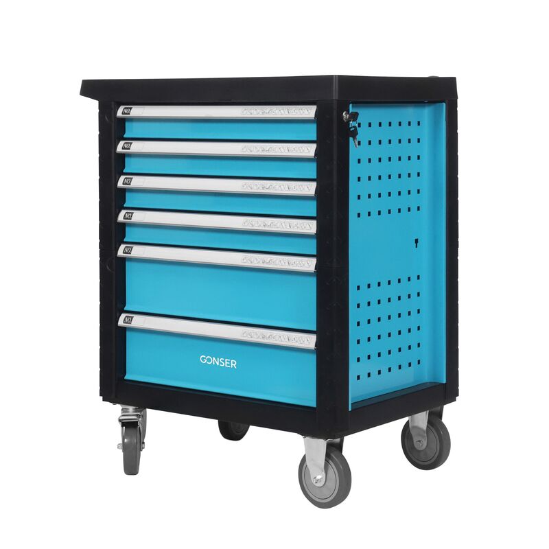 Dieser Werkstatttrolley mit sechs Schubladen lässt das Herz jeden Heimwerkers höher schlagen. In den vier oberen Schubladen befindet sich ein umfassendes Sortiment an Werkzeugen. Eine Schublade beinhaltet Kabelbinder sowie eine Box mit Schrauben und Nägeln. Die unterste Schublade ist leer und bietet Platz für grössere eigene Werkzeuge. Die Seitenwände aus Lochblech sind praktisch zum Einhängen von Zubehör. Vier grosse Räder mit Feststellbremsen und die handliche Griffstange sorgen für Mobilität. Damit nichts vom Wagen fällt, hat die Ablagefläche auf dem Trolley Vertiefungen. Hole dir diesen Werkzeugwagen und realisiere vielfältige Heimwerkerprojekte!