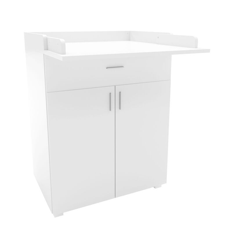 Säuglinge benötigen bis zu zehn neue Windeln am Tag und daher ist es wichtig einen gut eingerichteten Wickelplatz zu haben, der ganz deinen Bedürfnissen entspricht. Diese weisse Kommode ist besonders clever gebaut und verfügt über eine ausziehbare Wickelfläche, eine Schublade und Fächer für Kleidung und Wickelzubehör. Die Einlageböden der Regale lassen sich auf der gewünschten Höhe montieren. Die Türen der Kommode können sanft und leise geschlossen werden. Der Korpus selbst ist aus robustem Mischholz gefertigt und dank seiner weissen Melaminbeschichtung besonders kratzfest. Richte das Kinderzimmer ganz nach deinem Geschmack ein mit dieser praktischen Wickelkommode NOLA!